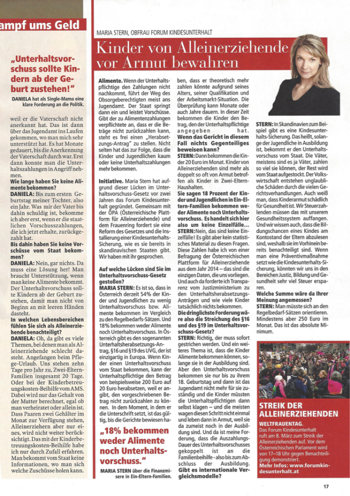 Kurier: Frauentag - Liste Pilz pocht auf Unterhaltsgarantie (7. März 2018)